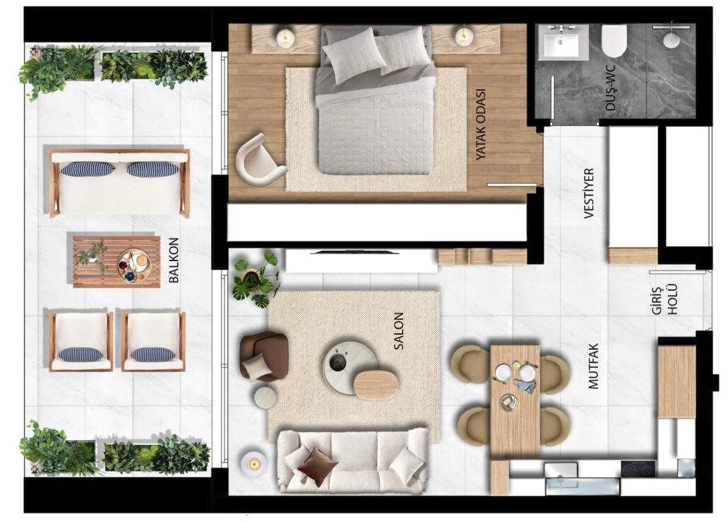 Bu 1+1 daire planı, modern yaşamın ihtiyaçlarını karşılayacak şekilde fonksiyonel ve ferah olarak tasarlanmıştır. Daireye girişte, alanı verimli kullanan bir antre yer alır. Antreden geçildiğinde açık plan salon + mutfak alanı bulunur; bu sayede hem daha geniş bir yaşam alanı hissi oluşturulur hem de gün ışığı mekâna dengeli şekilde yayılır.
